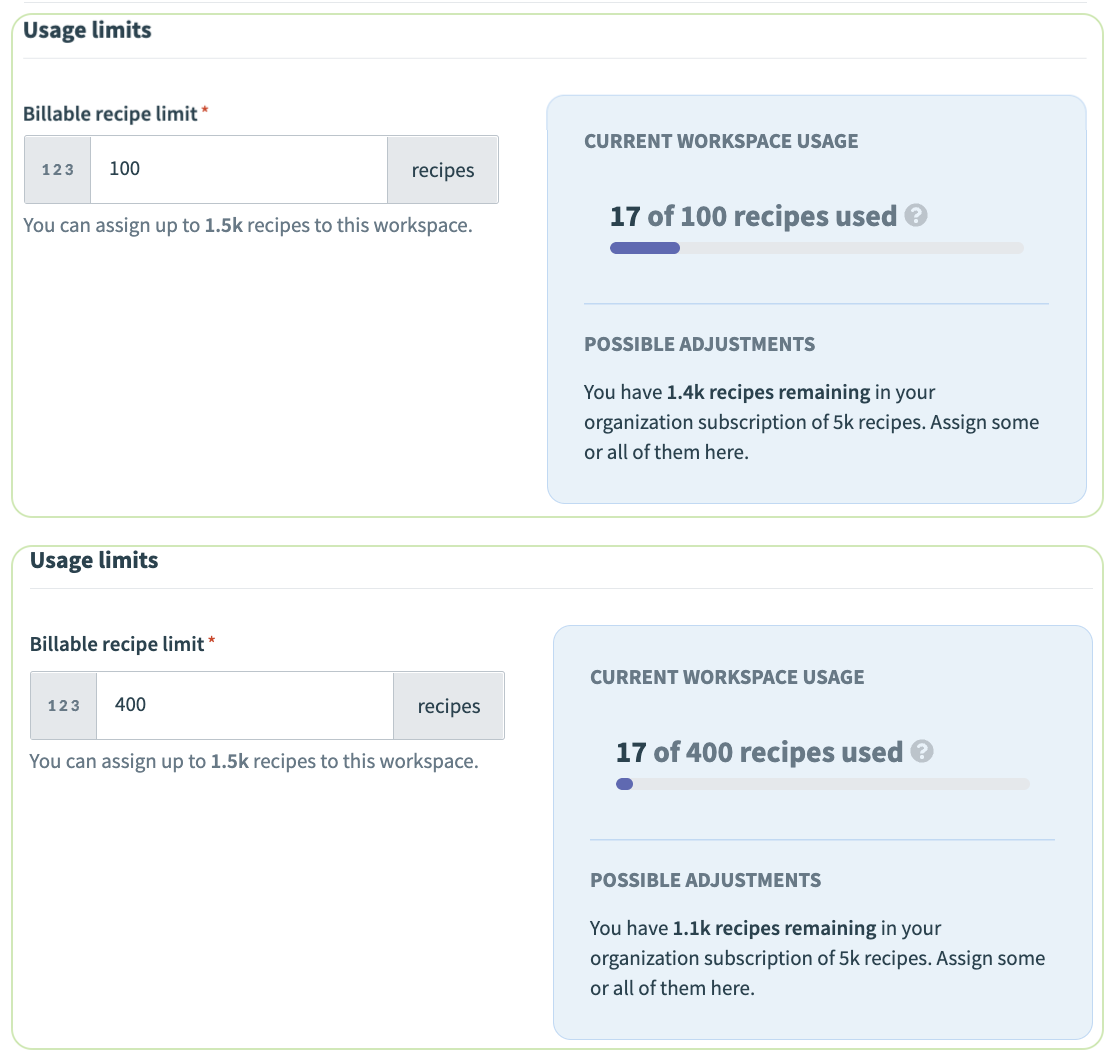 Changing the billable recipe limit in a managed workspace, from 100 to 400.