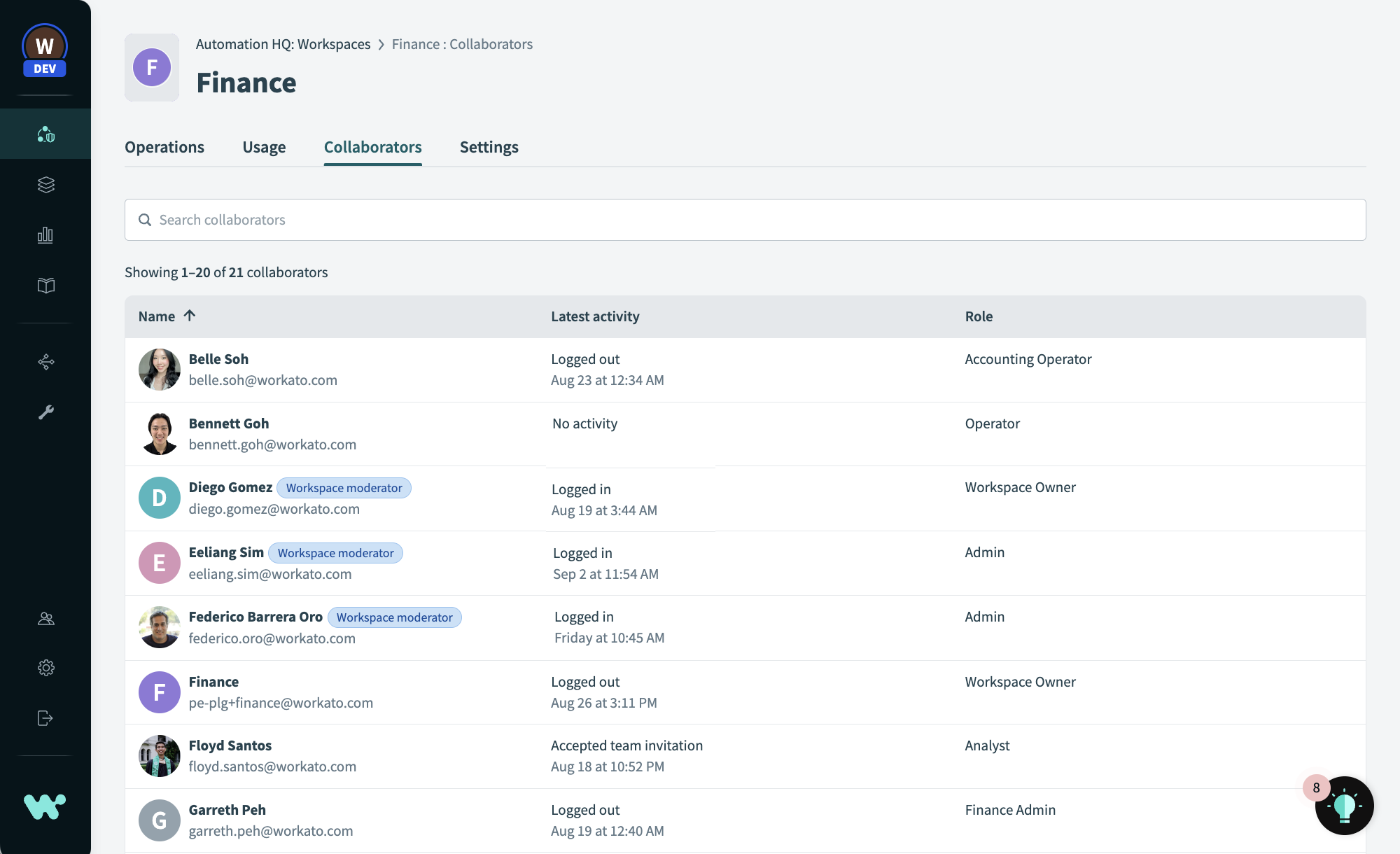 - All collaborators in the workspace appear here, with their email addresses. Some carry the "Workato moderator" tag, and some added their photo to their profile.