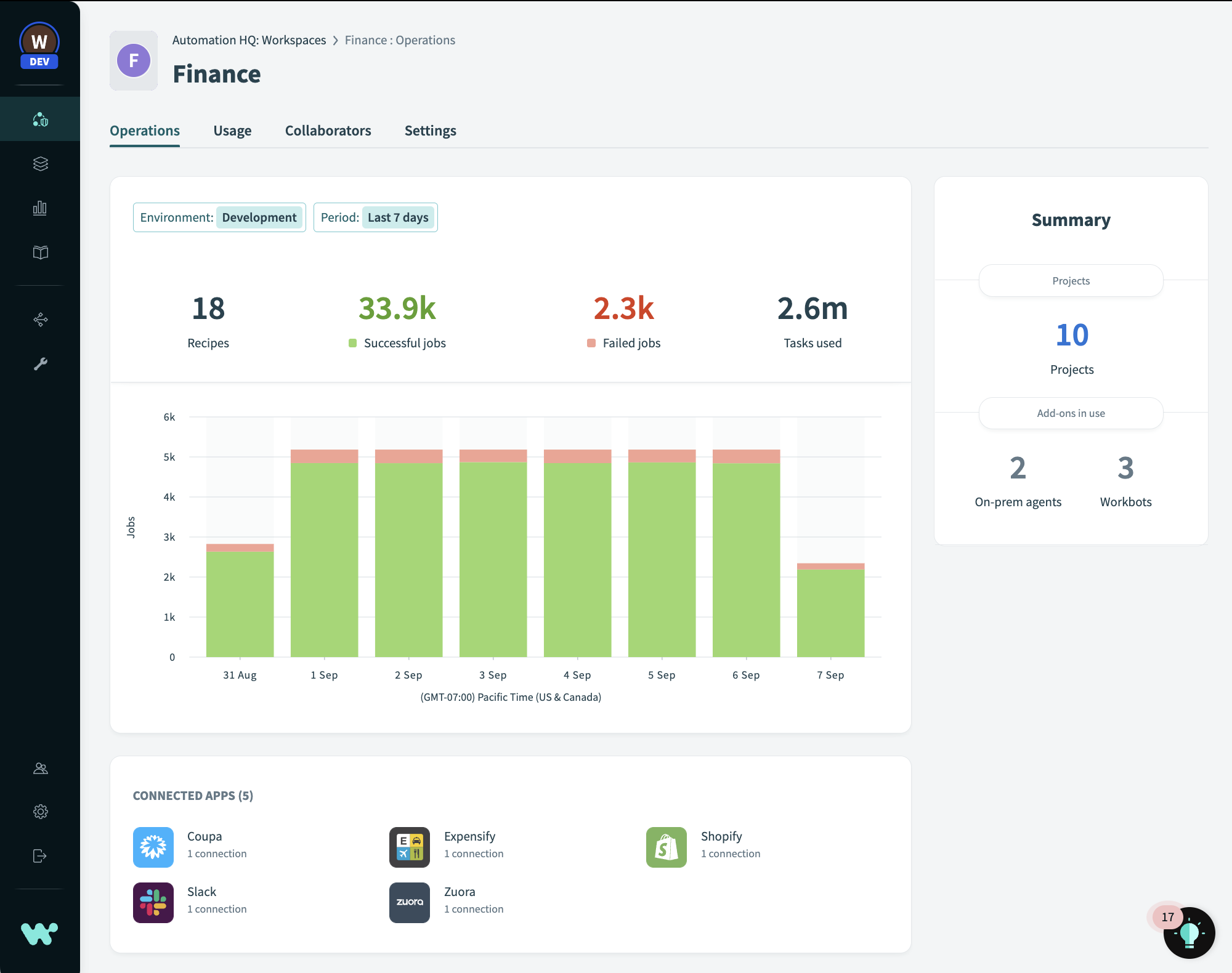 - Workspaces automatically get the add-ons, shared connectors, and assets within the HQ Workspace. Additionally, they can have their own projects, recipes, connections, properties, and other assets. Each workspace has a dashboard to monitor issues and control usage, and can independently configure notification settings and everything necessary for creating automations and operational management.