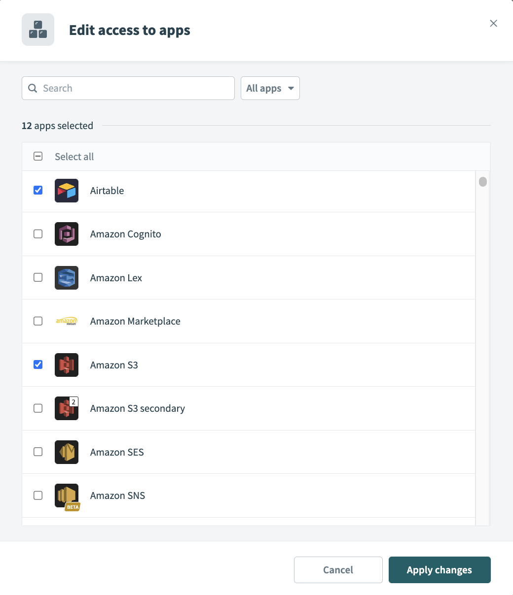 In the Edit access to apps modal, select new apps, or deselect currently selected apps.