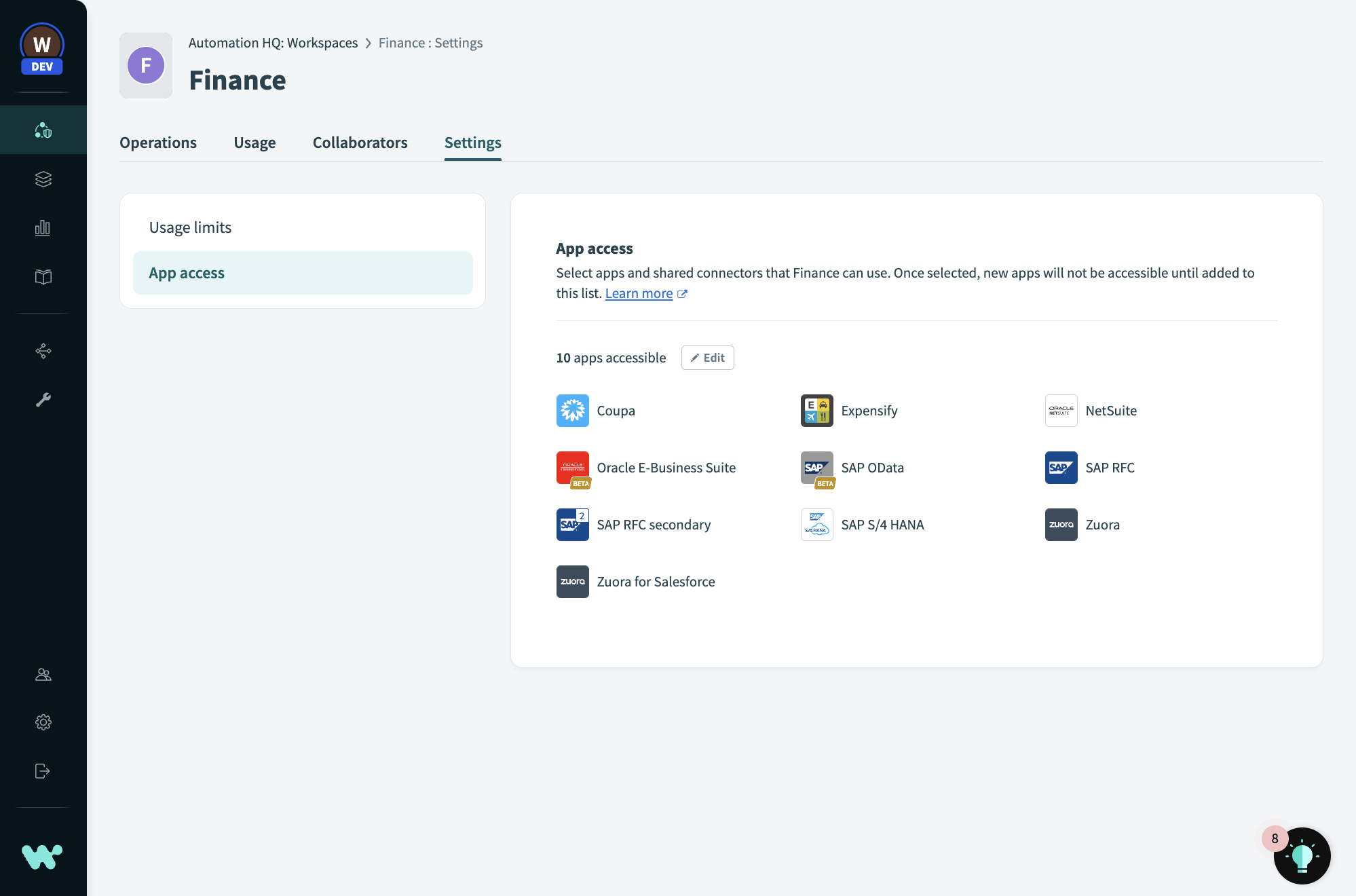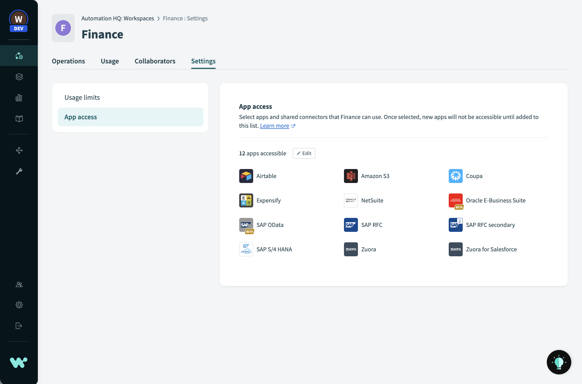 In Automation HQ, we have a high-level management view of workspaces. Moderators can define limits for each workspace, set up centralized audit log streaming, control available applications and shared connectors, and so on. However, general workspace operations take place directly inside the workspace itself. See Workspace.
