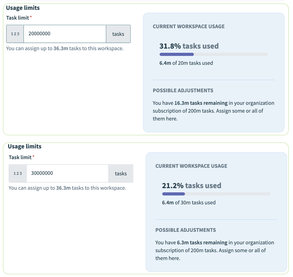 The interface also displays the Task limit. It reports the Current workspace usage as a horizontal scale, reporting the number of tasks used as a percentage of task limit.