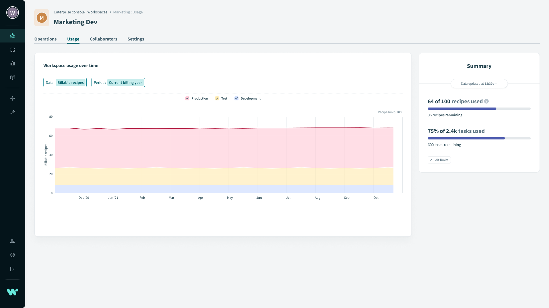 The interface displays the Billable recipe limit. It also reports the Current workspace usage as a horizontal scale, reporting the number of recipes actually used as a proportion of recipe limit.