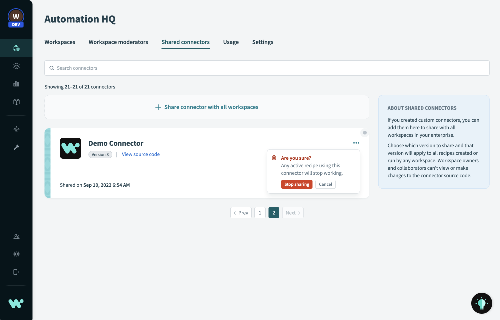 If you don't want to stop sharing the connector, click Cancel. This takes you back to the previous prompt in the dialog.