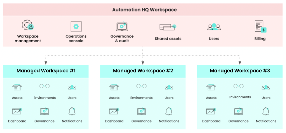 With Automation HQ, administrators can create and manage independent workspaces for different teams with unique needs, keeping control over usage and organization-wide rules that apply to each team.