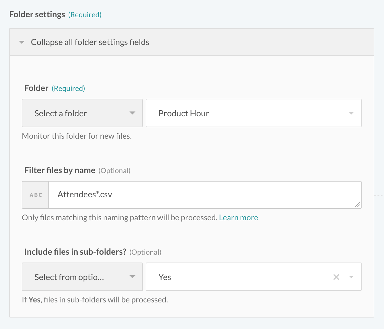 | Trigger on CSV lines in Attendees information | Attendees*.csv | Filter Attendees CSV files in a trigger |