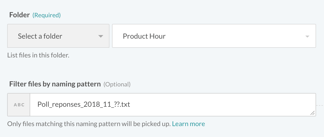 Frequently, you may have a log of multiple files with a naming convention. These names typically either includes an incremental count to represent the versions or timestamp to represent the effective date of the contents. Defining a naming pattern allows you to filter files based on these naming conventions. Workato uses the ? and * symbols to represent any single character or multiple characters respectively.