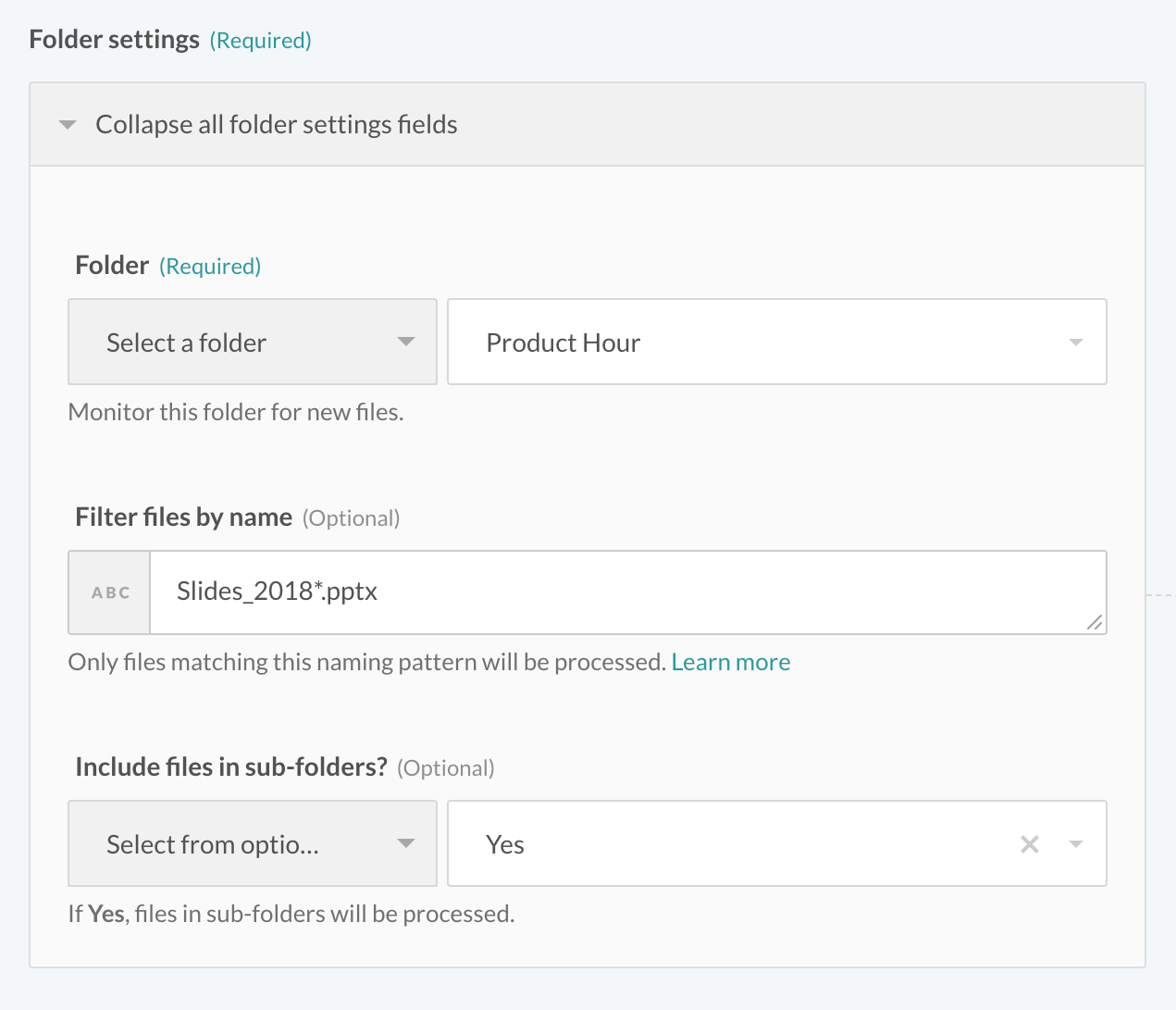 | Trigger on new Presentation slides in 2018 | Slides_2018*.pptx | Filter Presentation slides |