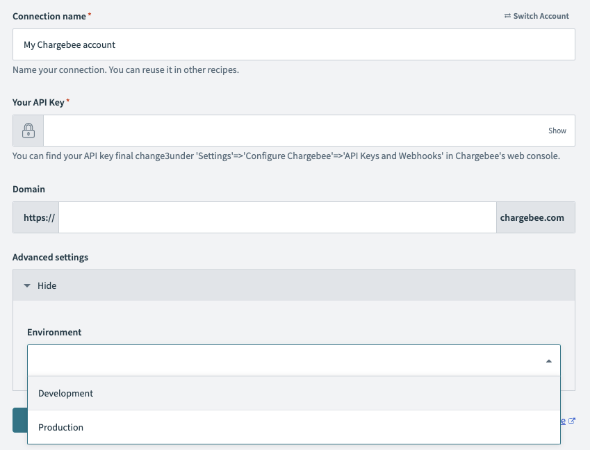 With extended_fields, you can dynamically display additional fields based on previous input fields. If your connection setup is complex and consists of many input fields, consider limiting the number of fields that a user can see. Instead of displaying all fields at the same time, use extended_fields to control how many fields to display to the user initially, and when to display additional fields.