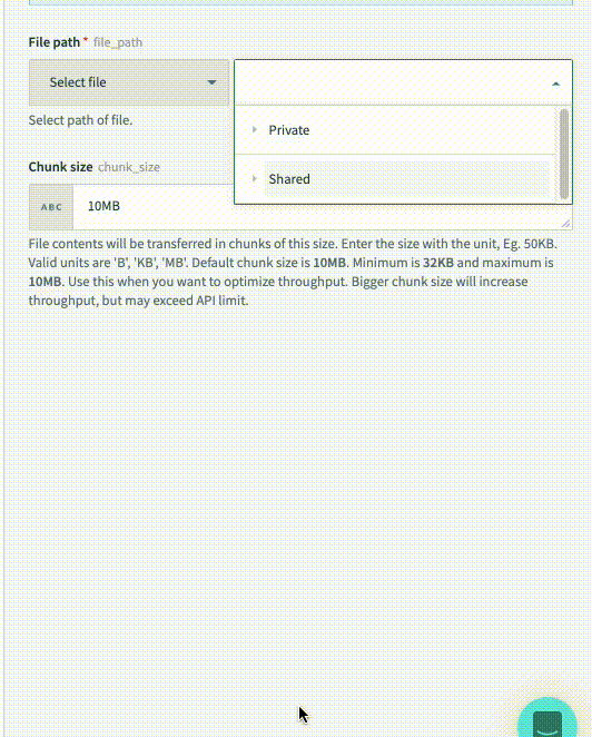 In the above case, we have wanted to only allow users to select files to be downloaded. However, in a variety of cases, you might want to allow users to also select folders (the nodes) as you want them to provide a path to a folder instead of a file. This can be configured like below: