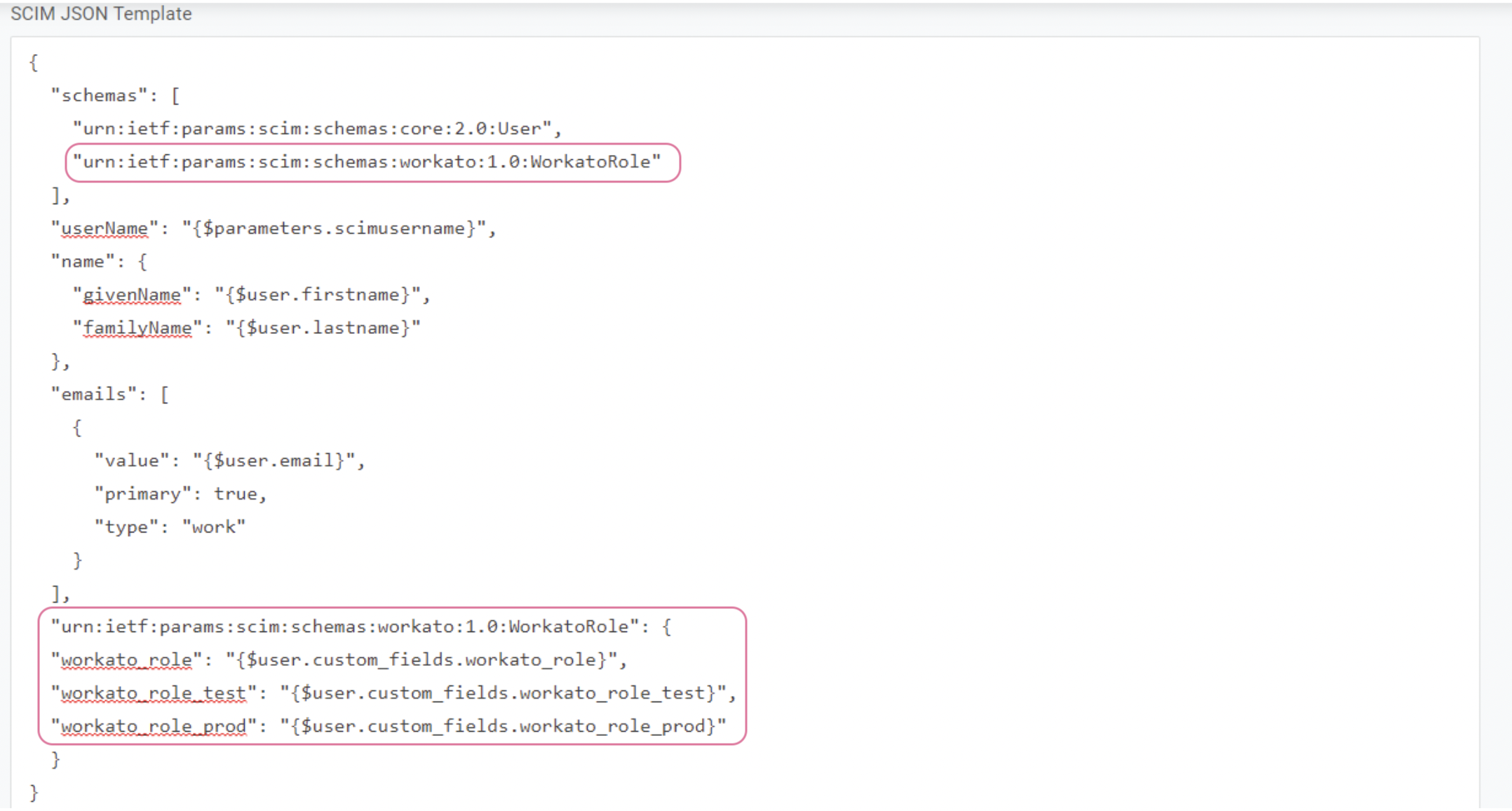 urn:ietf:params:scim:schemas:workato:1.0:WorkatoRole - After emails, within the rest of the schema, add the following code: