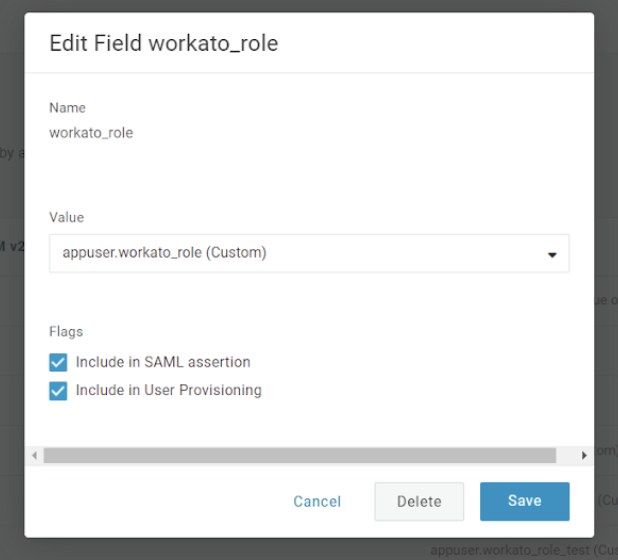 If you did not configure the custom user fields for updating Workato roles through SAML Roles Sync, complete the configuration of custom user attributes like “workato_role”, “workato_role_test”, and “workato_role_prod” before moving on to the next step. See SAML role sync.