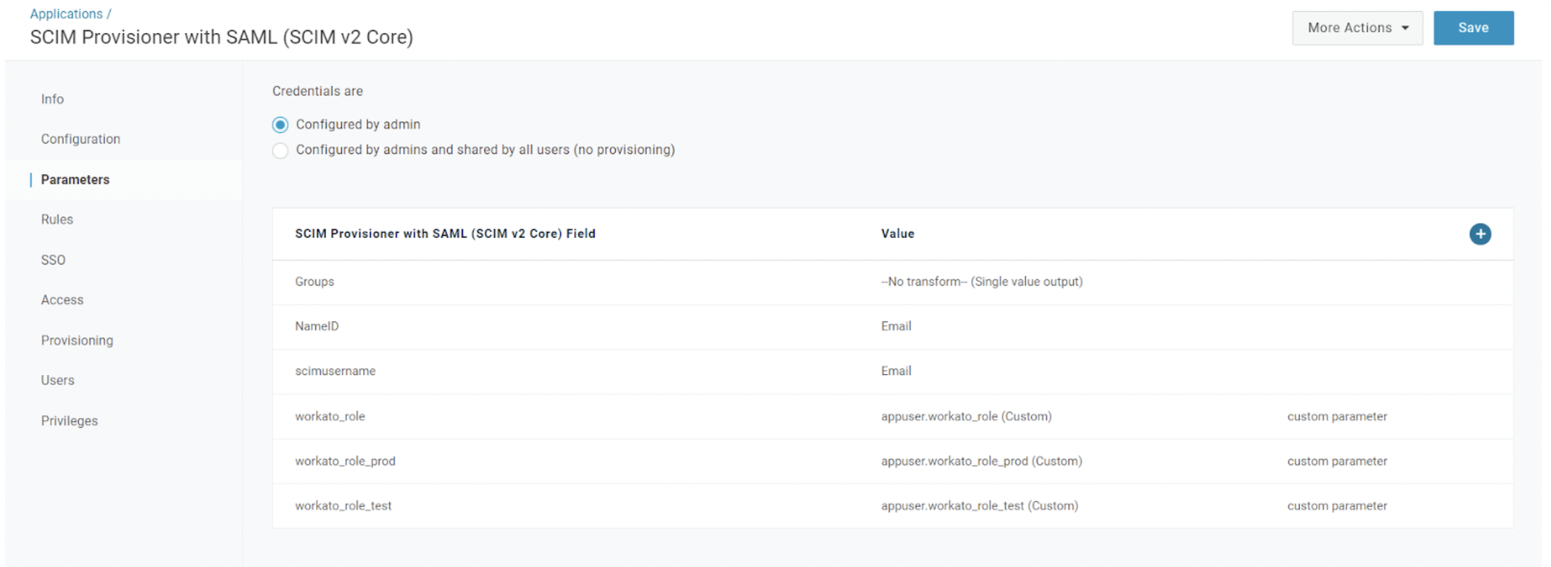 Navigate to the Parameters interface, and edit the workato_role by adding the following fields to reference the workato_role attribute values: