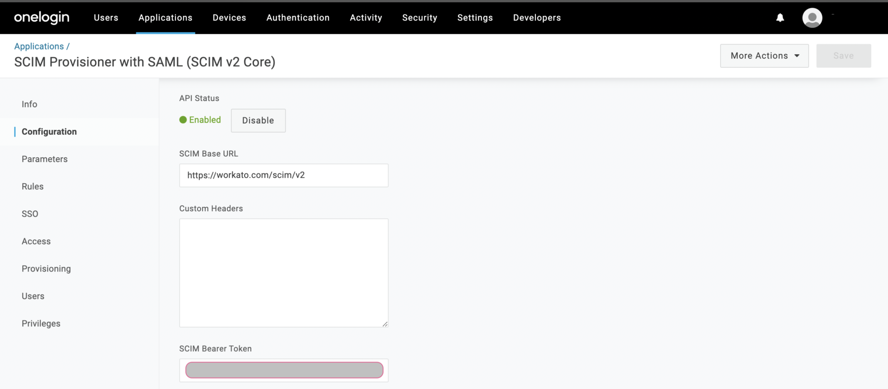 To disable SCIM, follow these steps in OneLogin. Alternatively, you can disable SCIM in Workato.:
