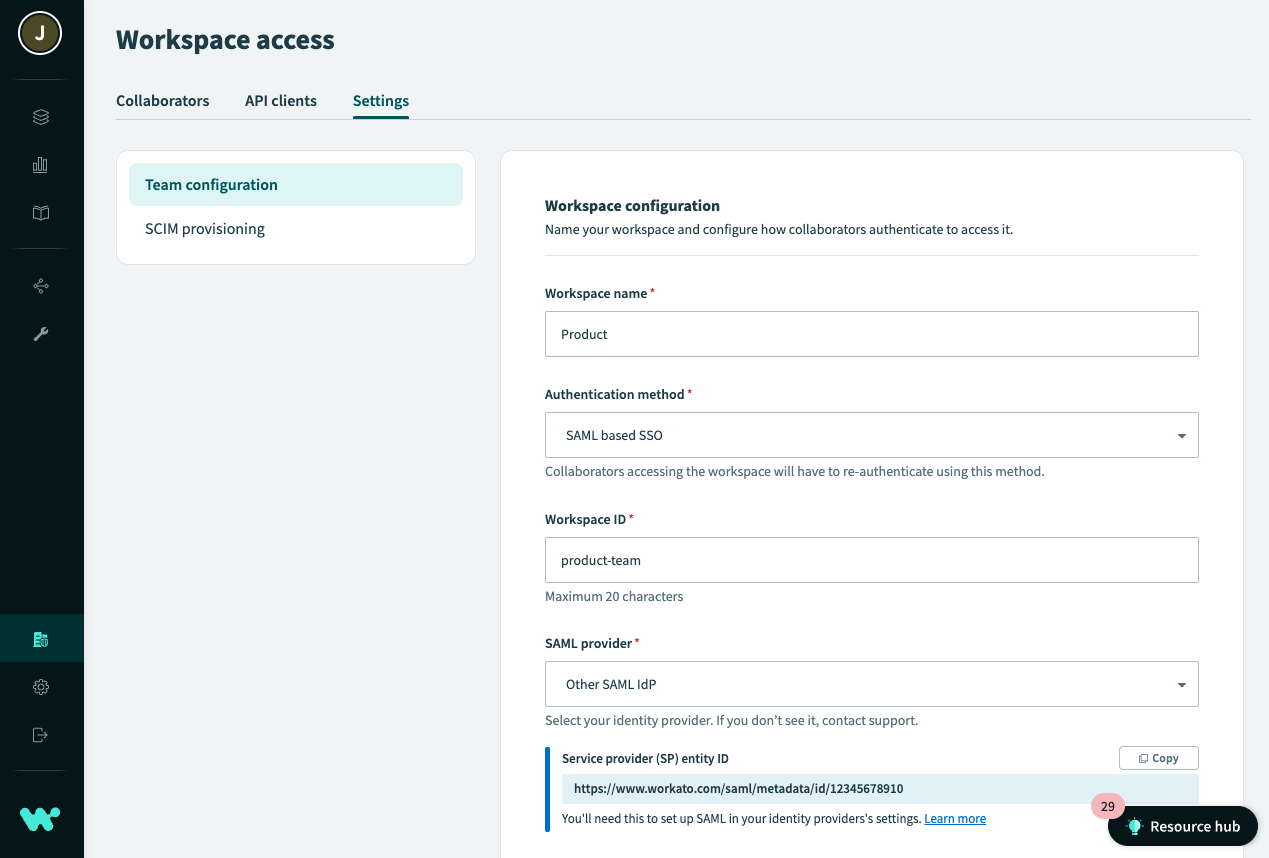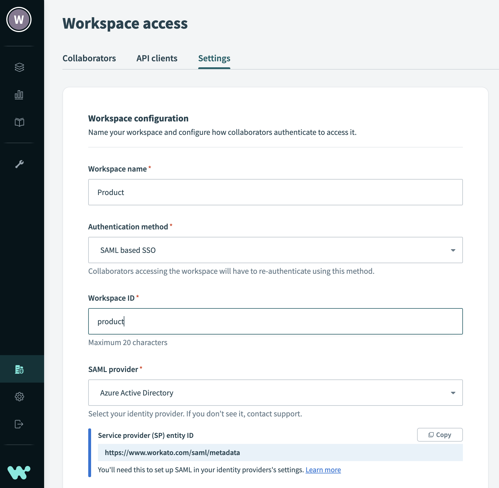 - Enter in the Service provider (SP) entity ID obtained from Workato.