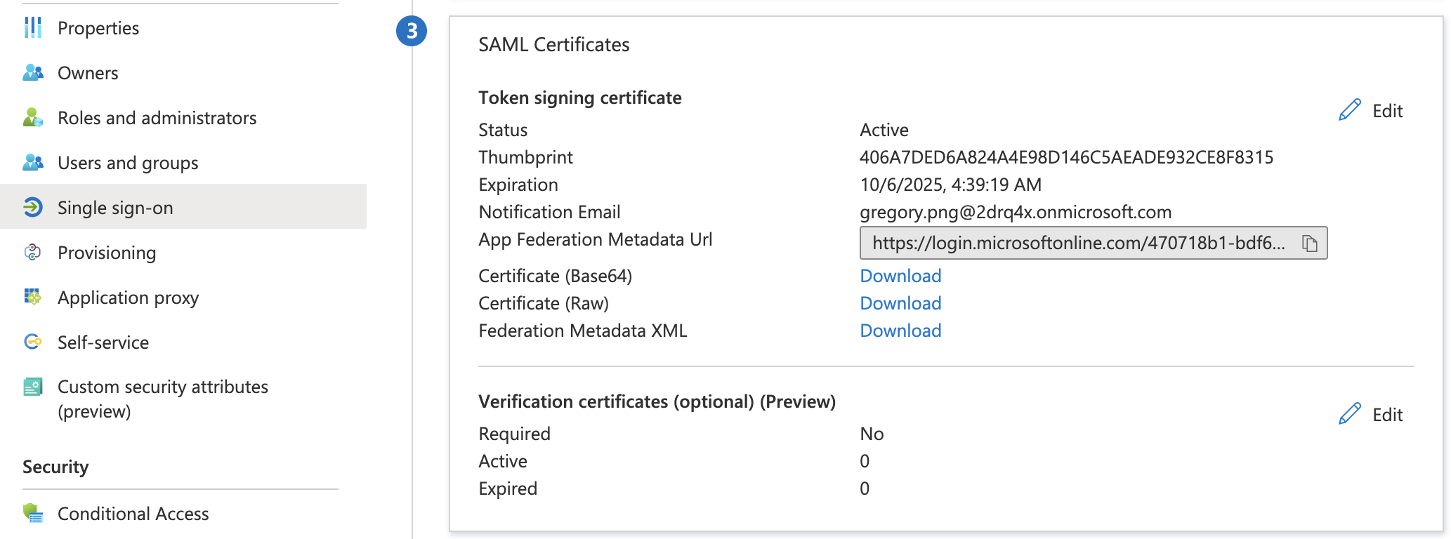 In Single sign-on, find the details of the SAML Certificate.