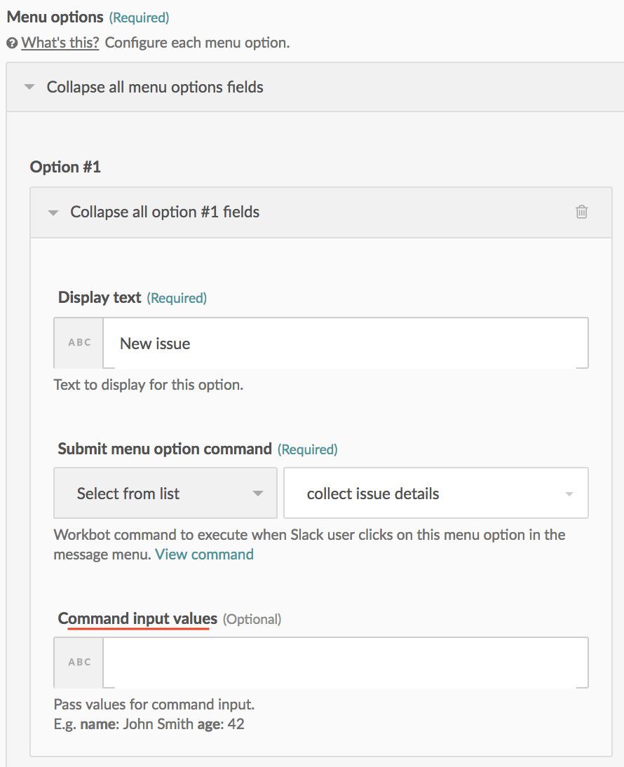 In the example above, both the button and the menu option sends a Workbot command to collect issue details.