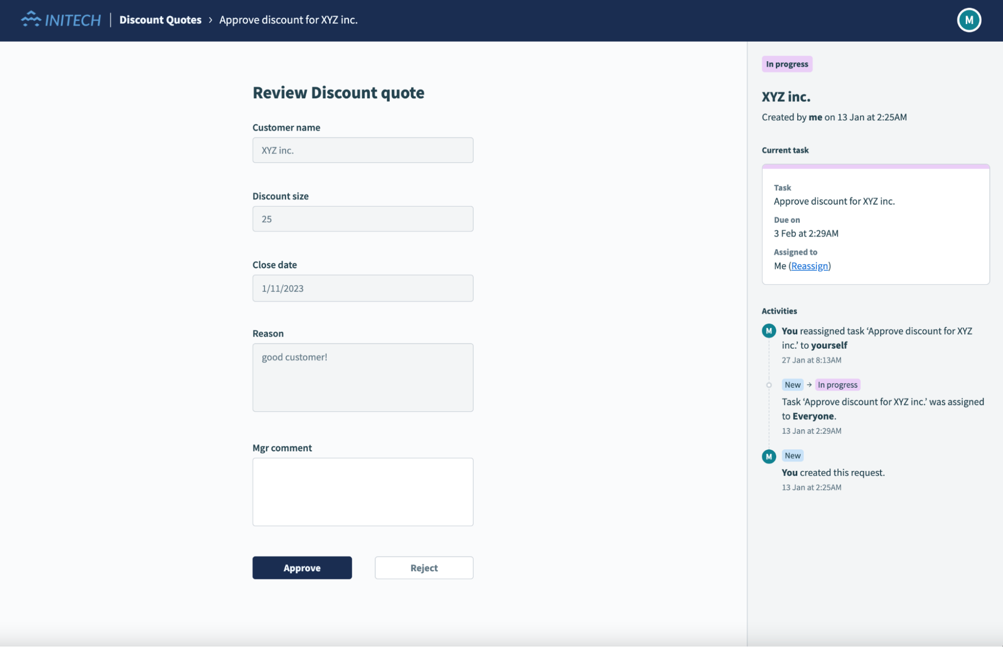 Managers and assignees can reassign the request to another user by clicking the Reassign link in the right panel.